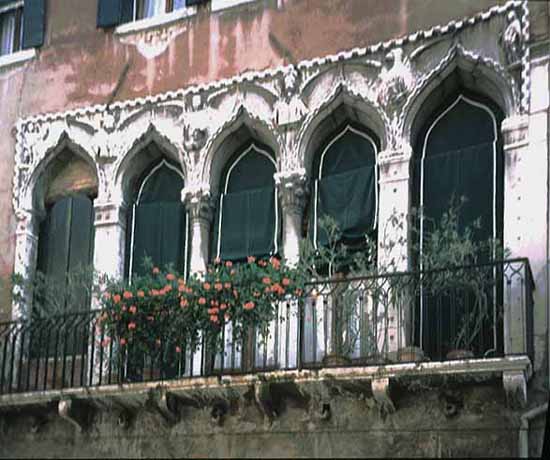 This is typical of Venetian Gothic work. Although this is a standard Gothic arch, it is finished in a typically Venetian manner, with striped red and white edging, and an elaborate mixture of quatrefoil and trefoil tracery work.